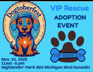 VIP RESCUE ADOPTION EVENT What: DOGTOBERFEST – When: Nov. 15 2025 SATURDAY from 11AM – 5PM Where: Highlander Park, 903 Michigan Blvd, Dunedin, FL EVENT: Includes a pet adoption event, various vendors, food trucks, a cycling event, games, beer,and more. Bring your… Read more: DogtoberFest – Dunedin November 15th 11a-5p - FOSTERS NEEDED at VIP RESCUE